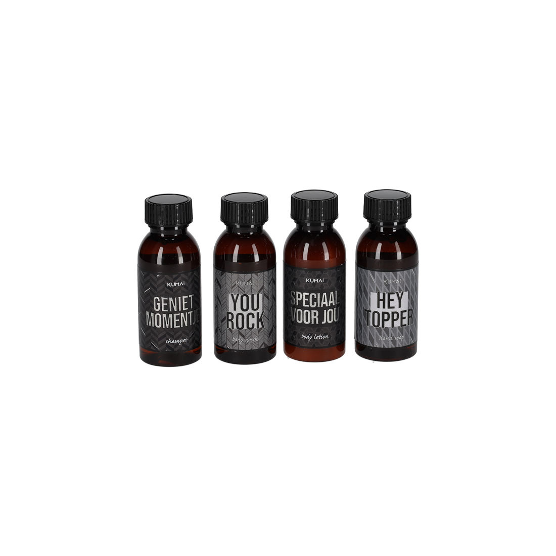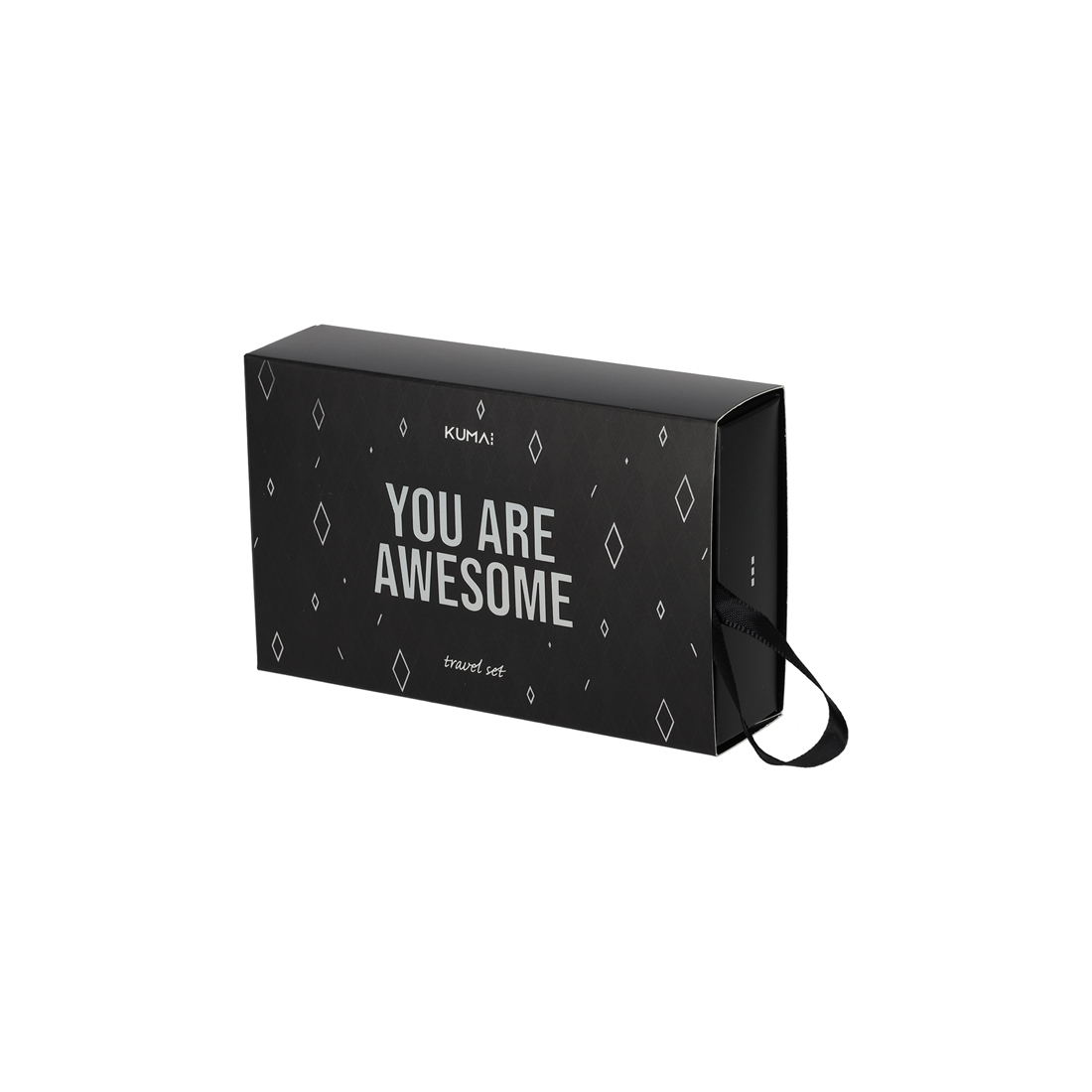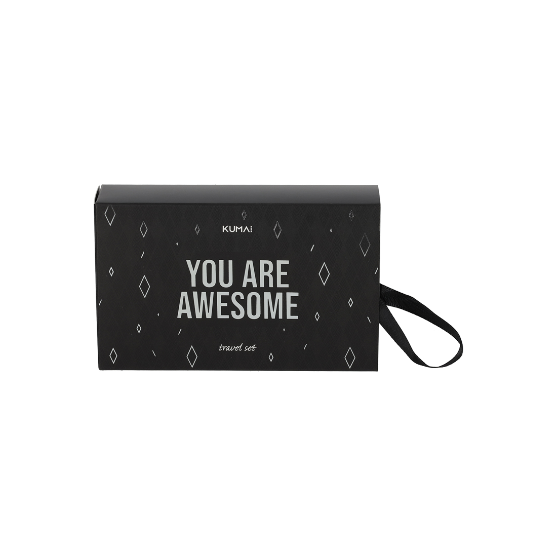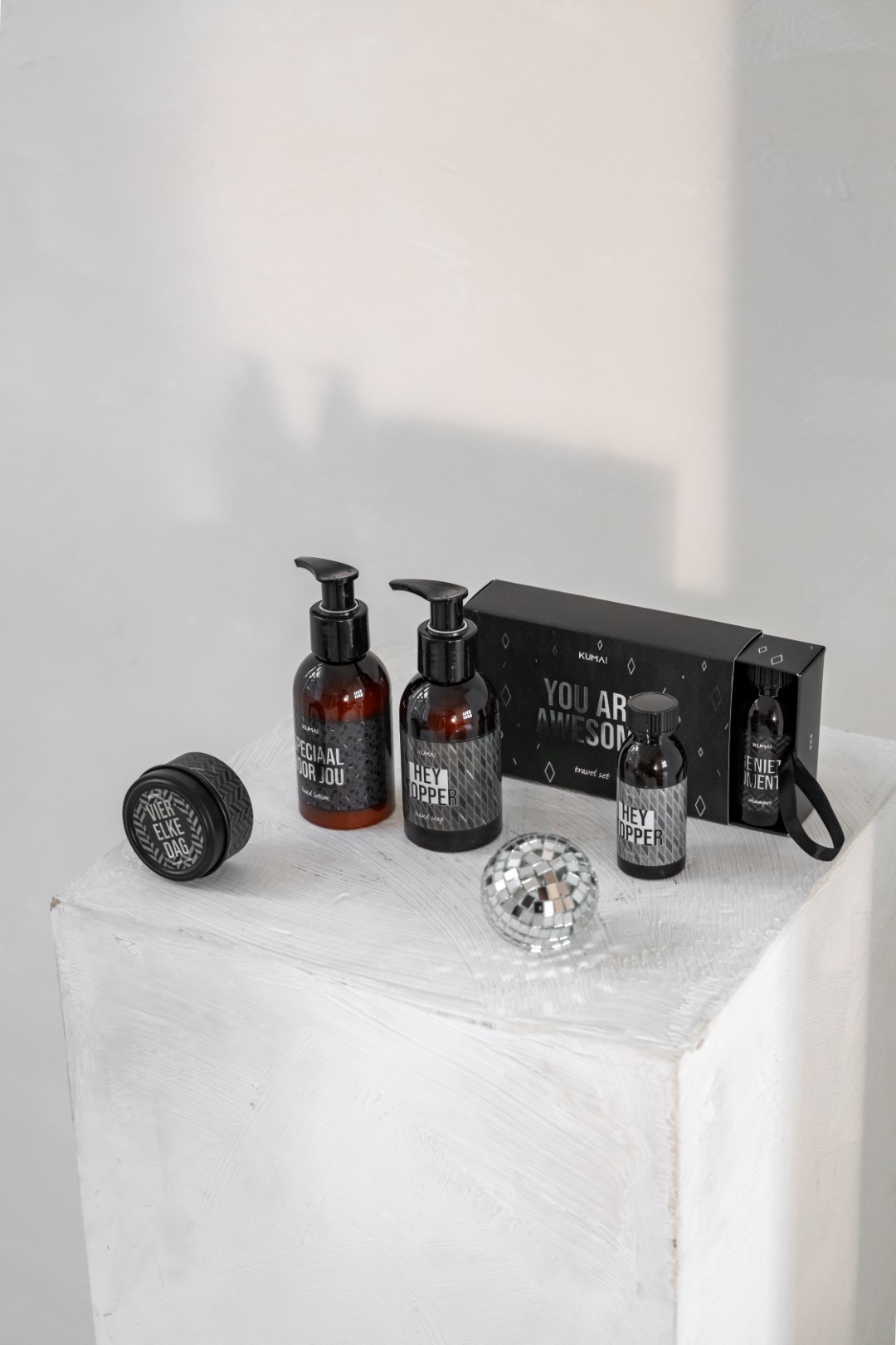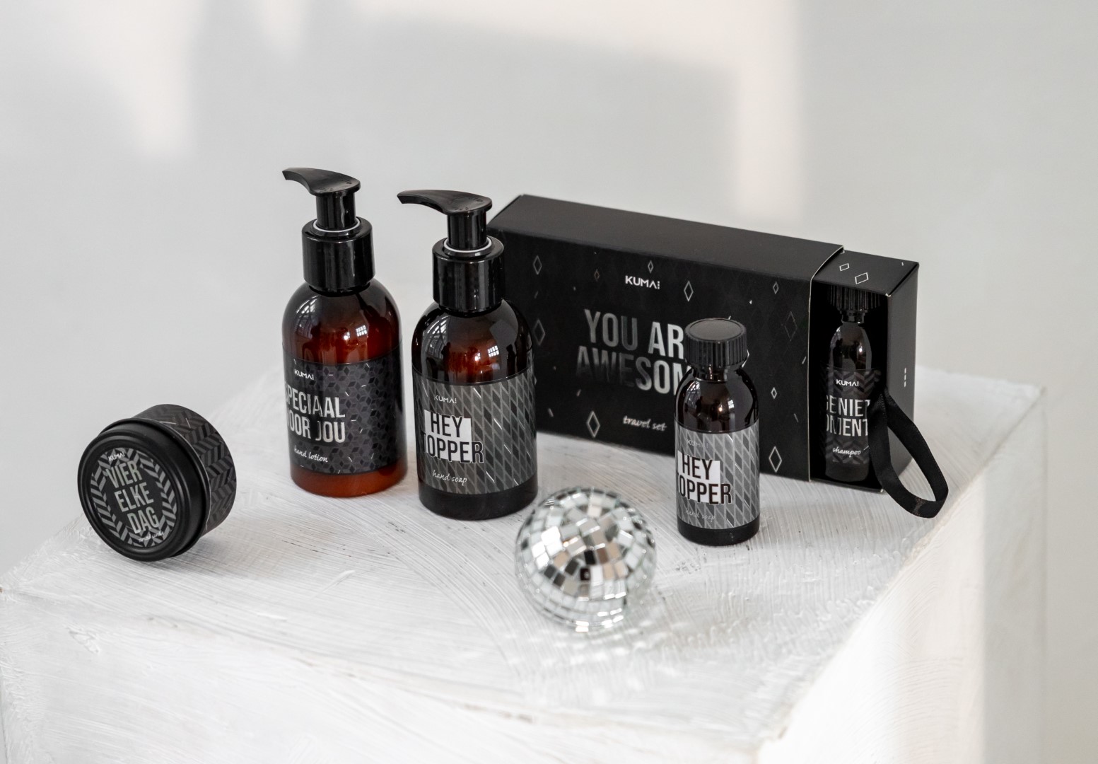 You are Awesome! Naast een mooi compliment gaat het hier om een vegan travelset welke shampoo, bodylotion, body wash en handlotion bevat. De flesjes hebben een inhoud van 40ml en zijn hierdoor ideaal om mee te nemen in de handbagage. De flesjes hebben een heerlijke geur van jasmijn, rozemarijn en muskus. Door de milde ingrediënten is dit reissetje geschikt voor alle huidtypes. Dankzij de mooie showdoos is het een perfect cadeau om te geven of te krijgen. Dit artikel is 100% vegan.