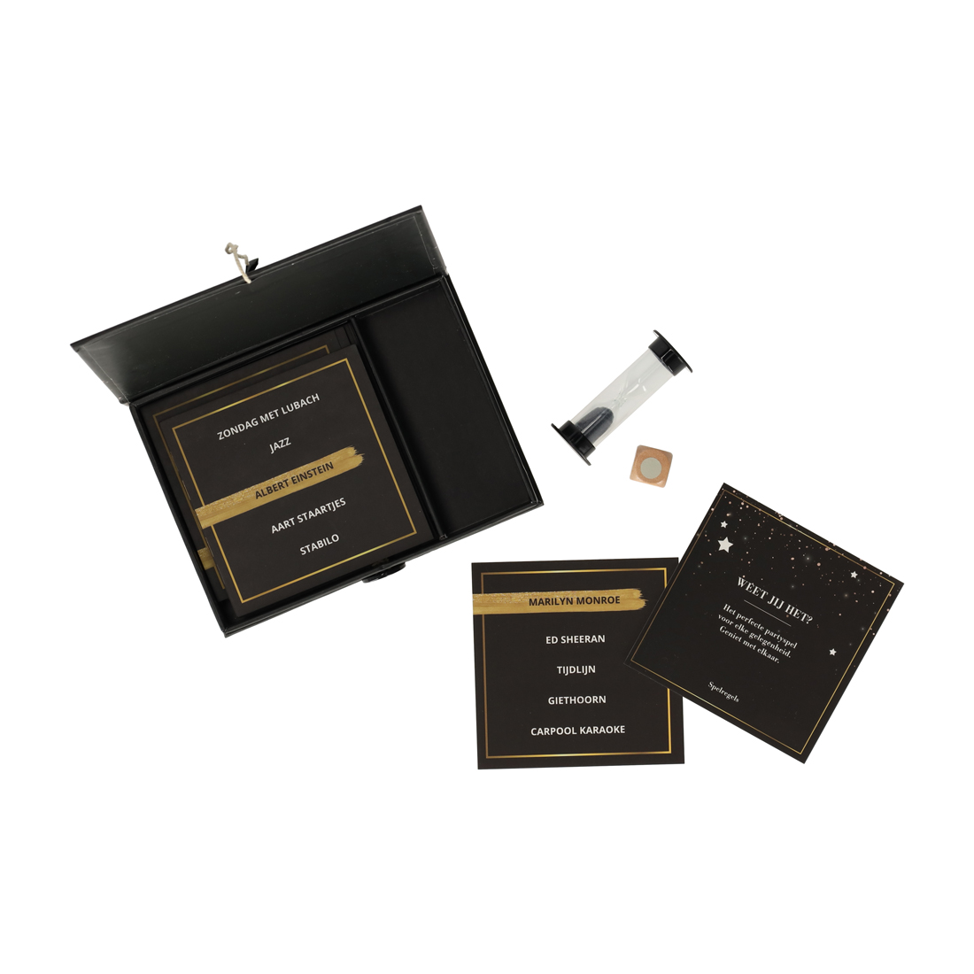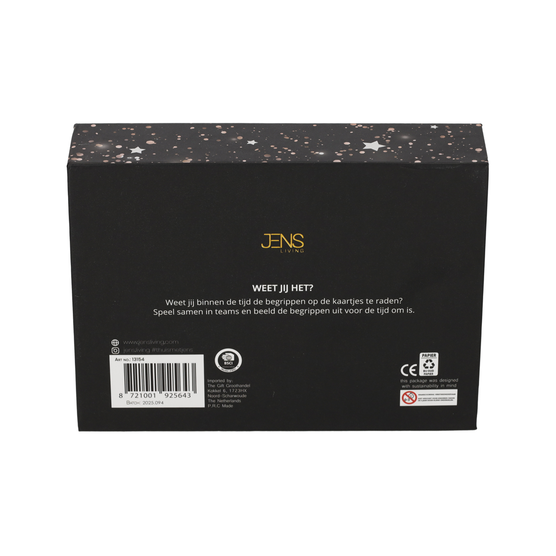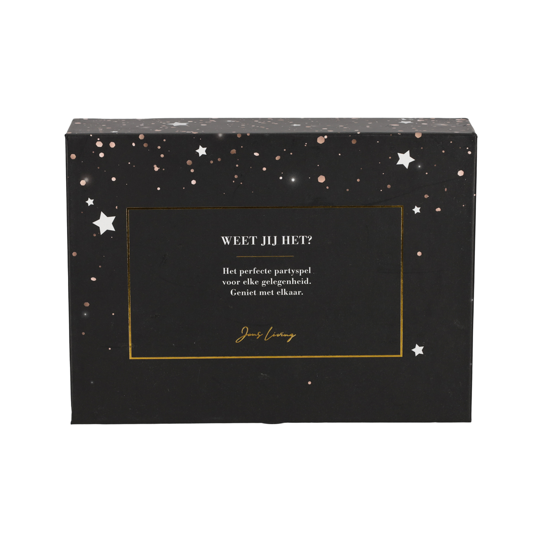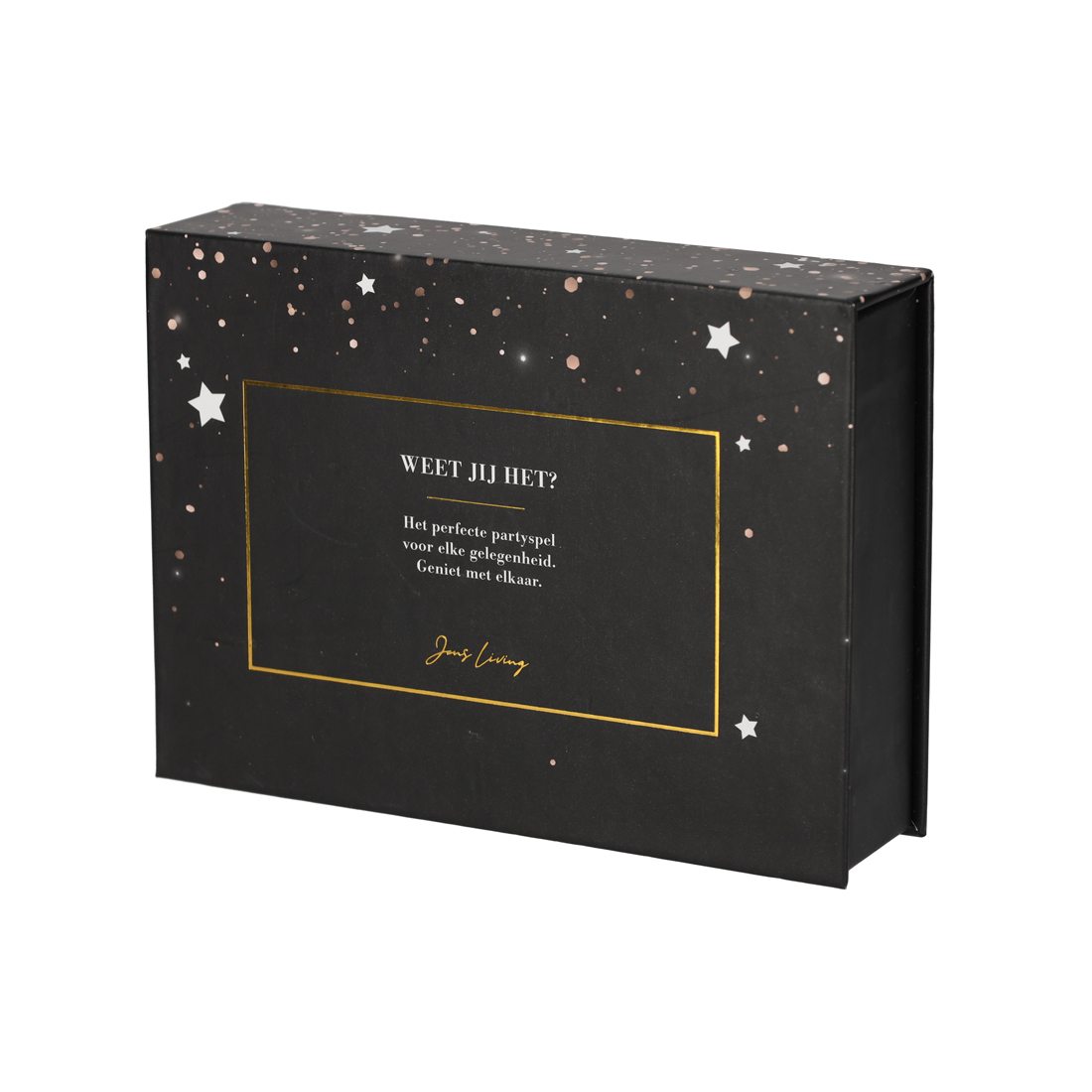 “Weet jij het?” is een uitdagend spel waarbij je in meerdere teams begrippen moet omschrijven en raden voordat de tijd om is. Om het spel extra spannend te maken staat er op elke speelkaart een bonusbegrip waarmee extra punten te winnen zijn. Elk spel bevat 50 dubbelzijdige speelkaarten met in totaal 500 begrippen, een zandloper van 40 seconden en een dobbelsteen om de kant van de speelkaart te bepalen.
